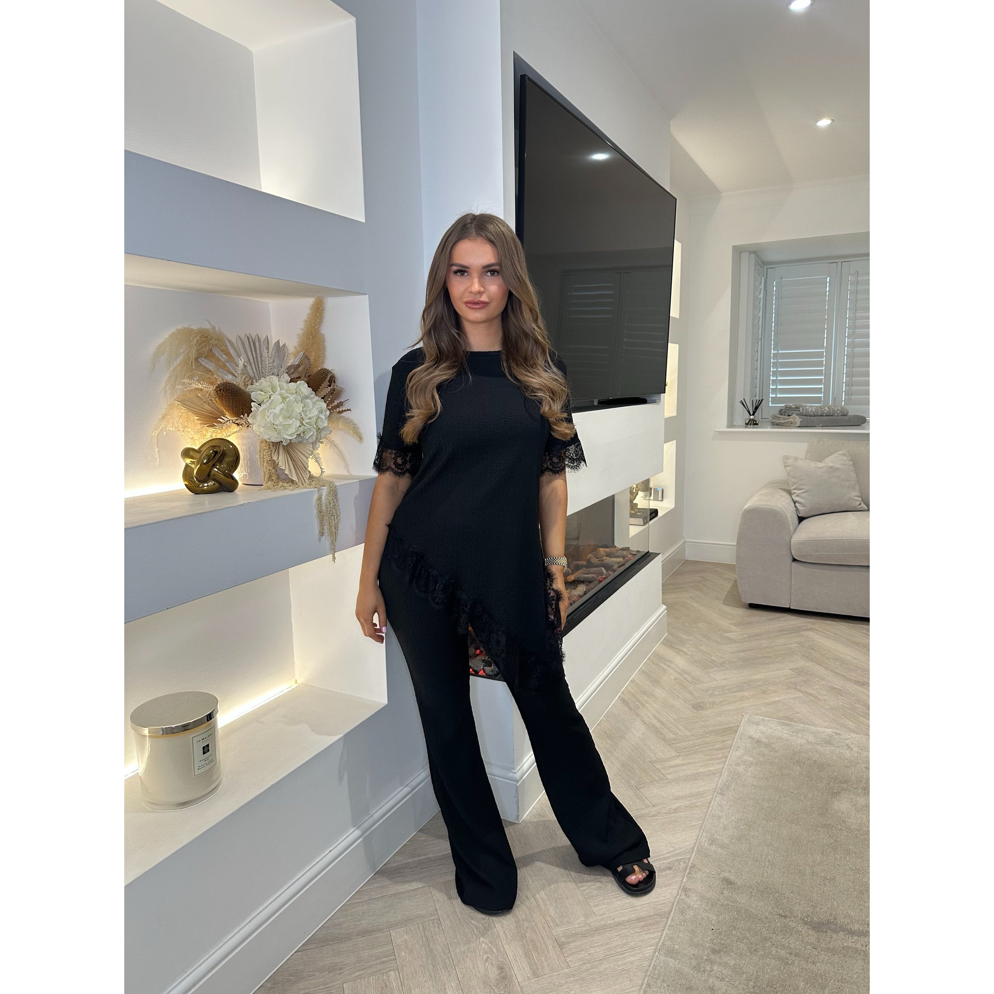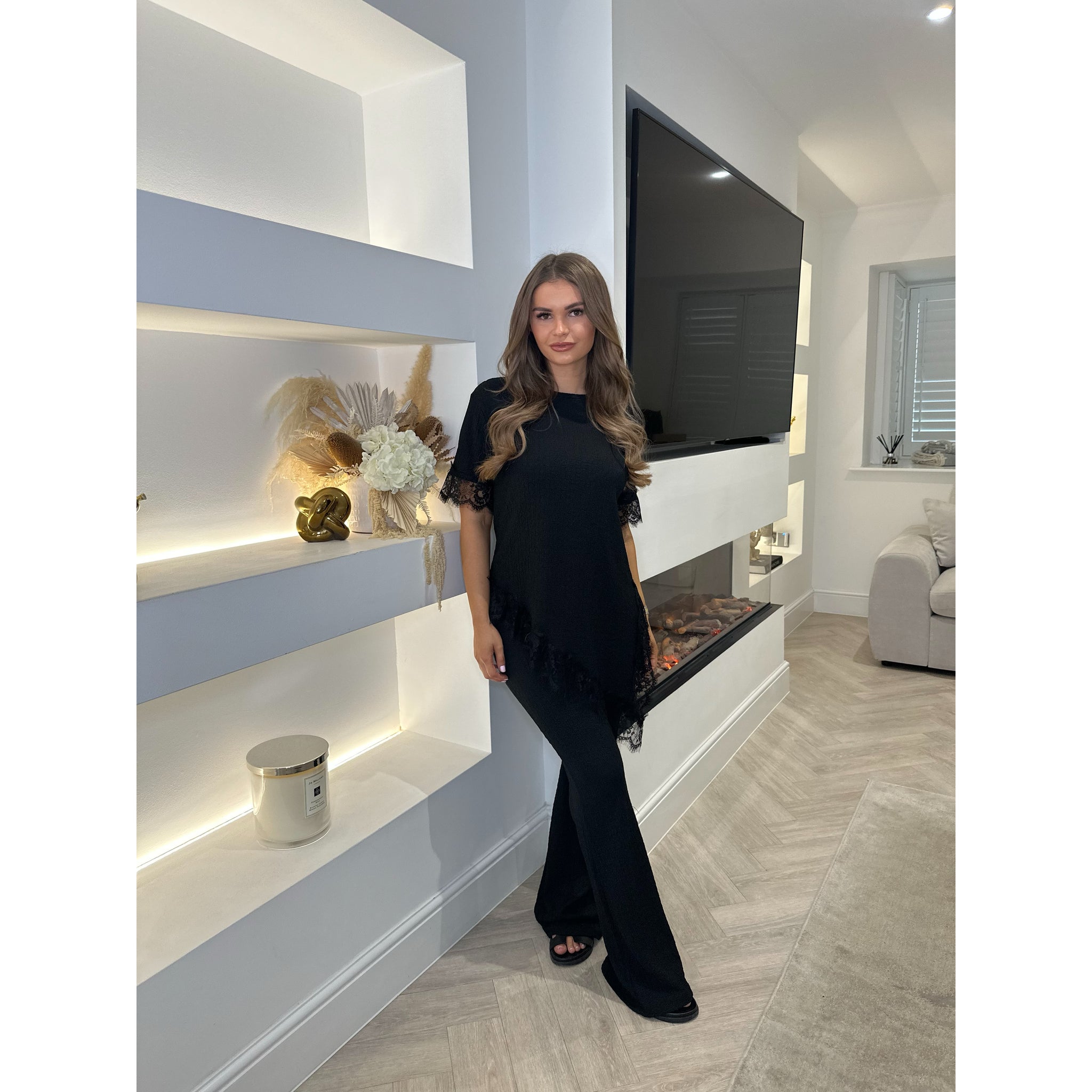 Black Lace Trim Asymmetric Crinkle Lounge Set