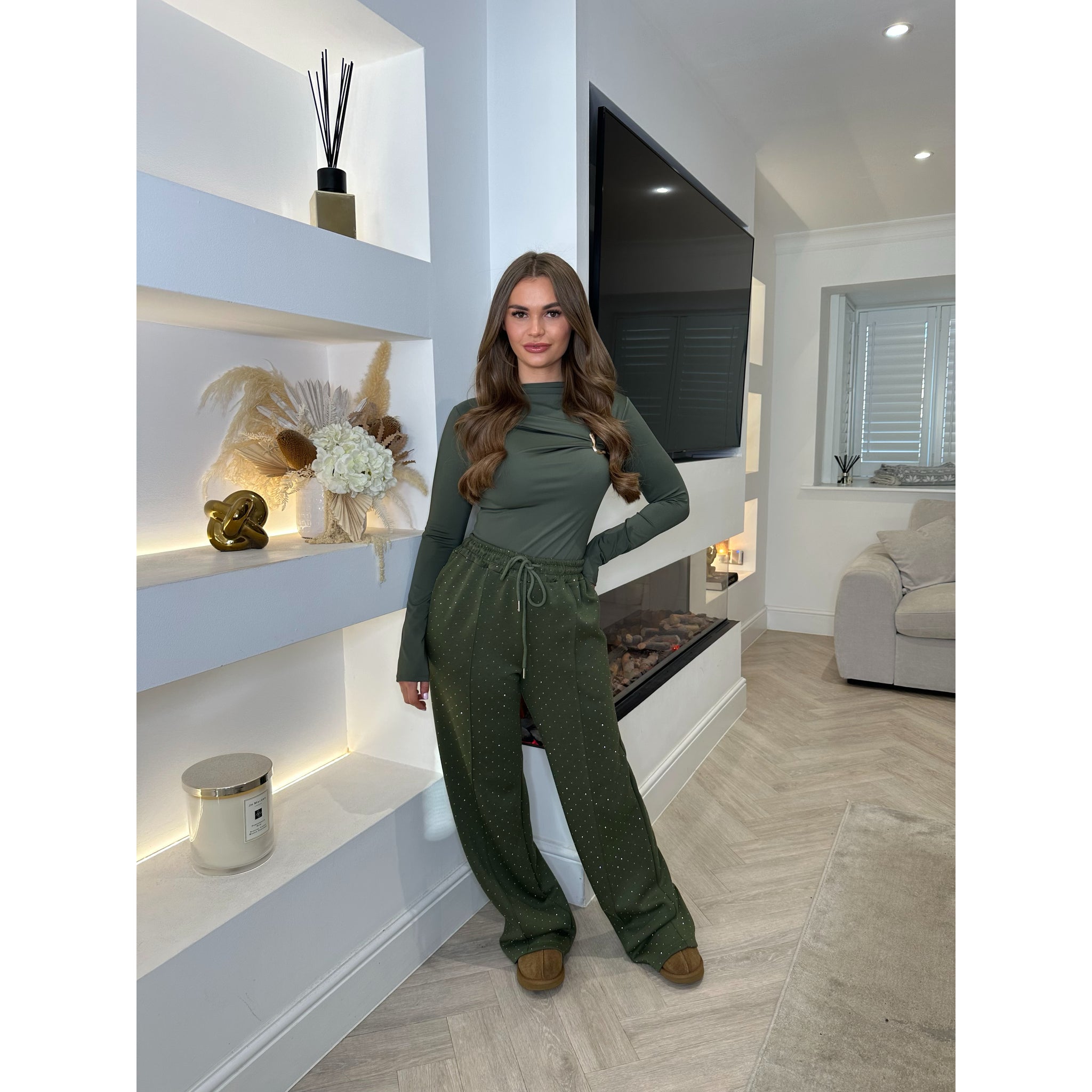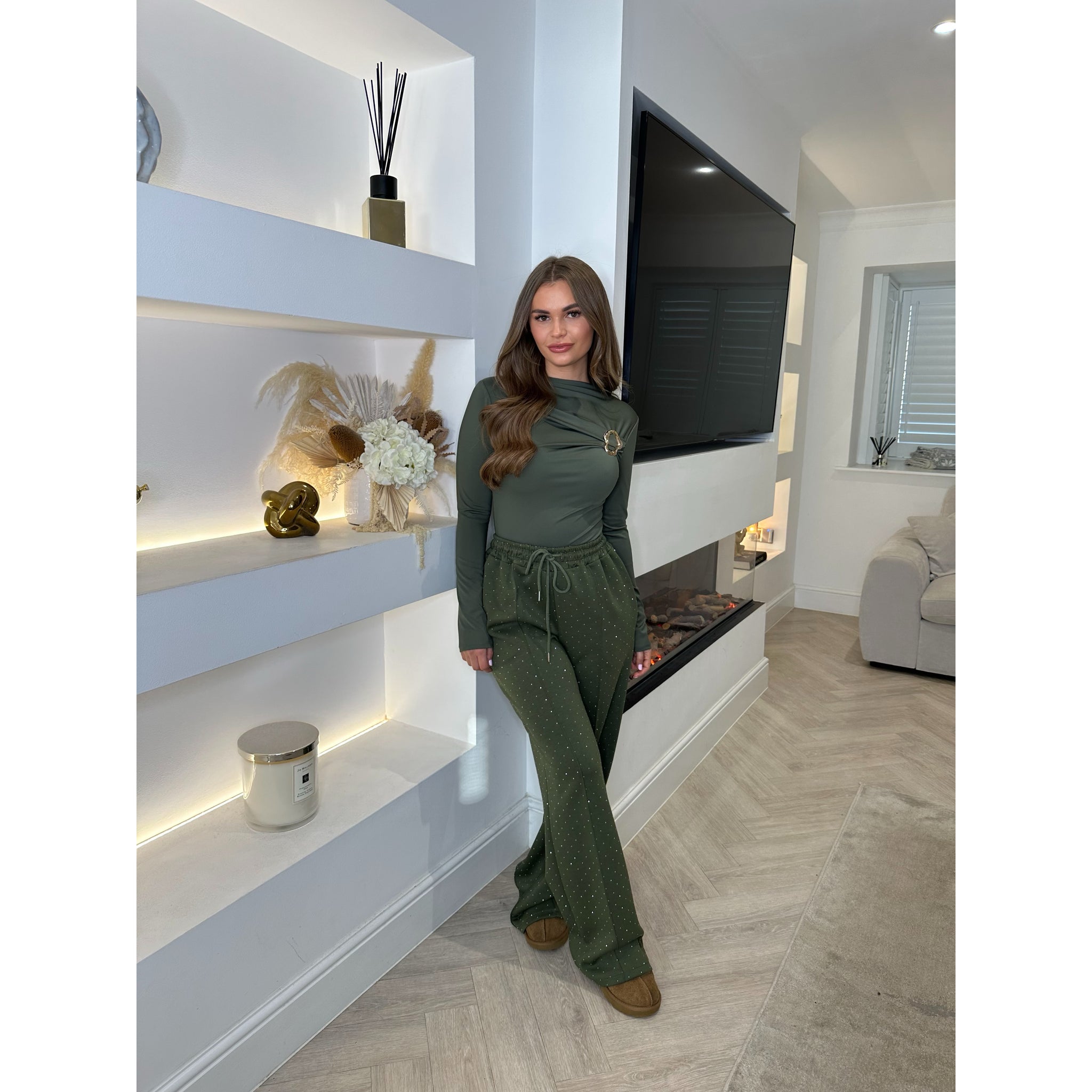Khaki Buckle Ruched Detail Long Sleeve Top