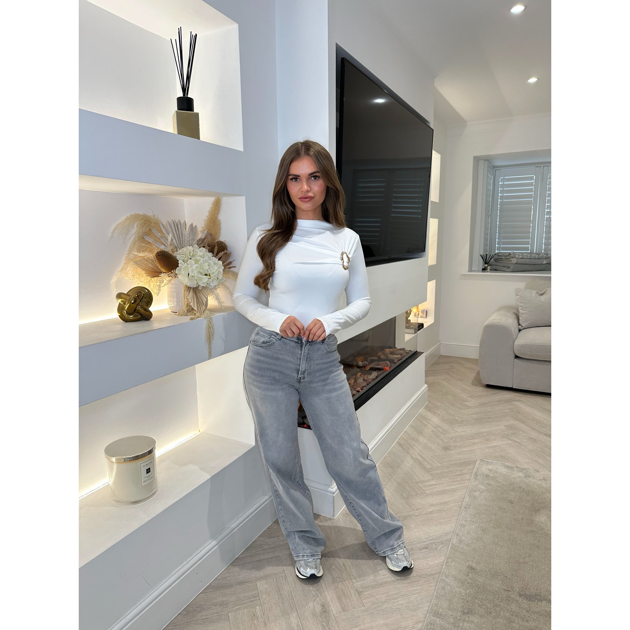 White Buckle Ruched Detail Long Sleeve Top