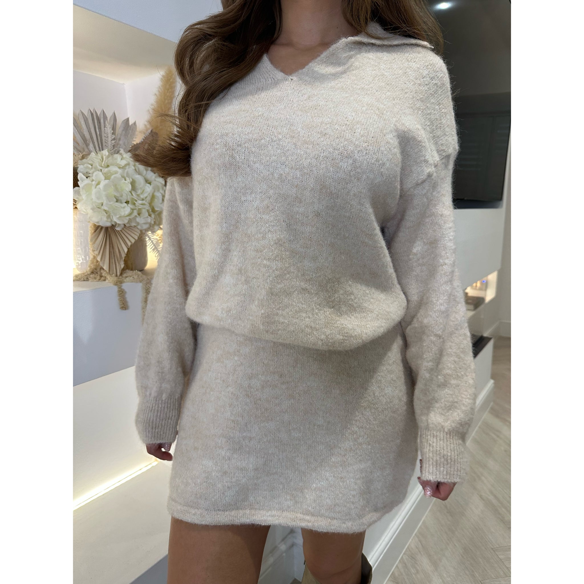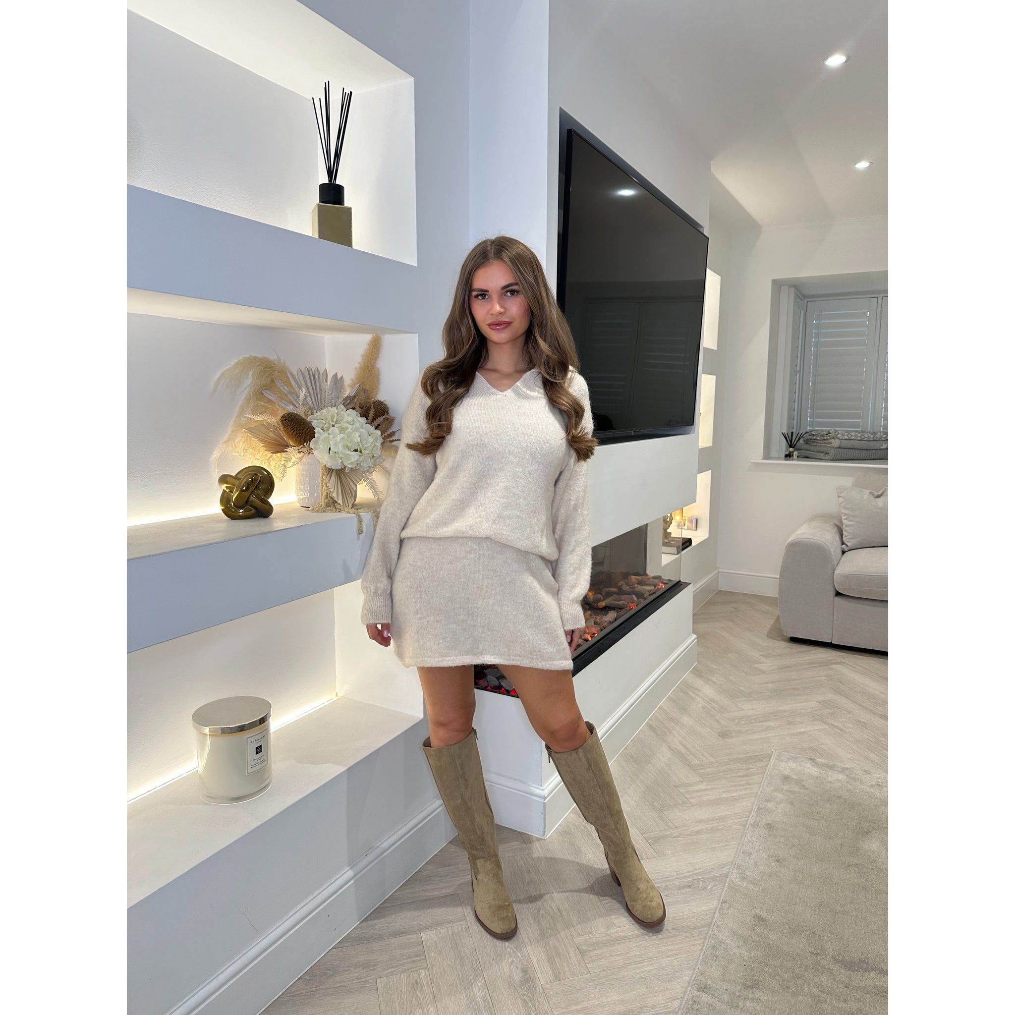 Beige Wool Blend Collared Knit Skirt Co Ord