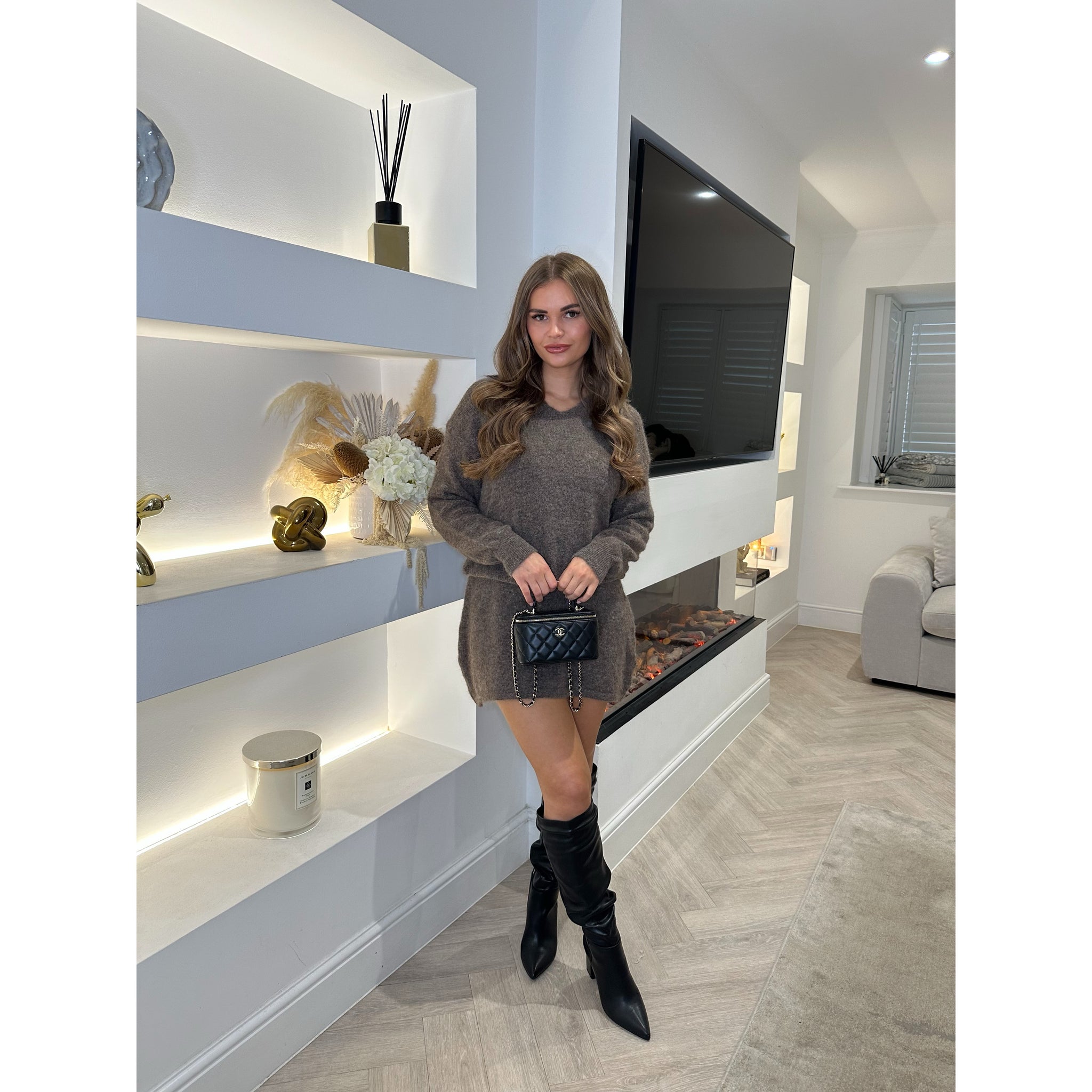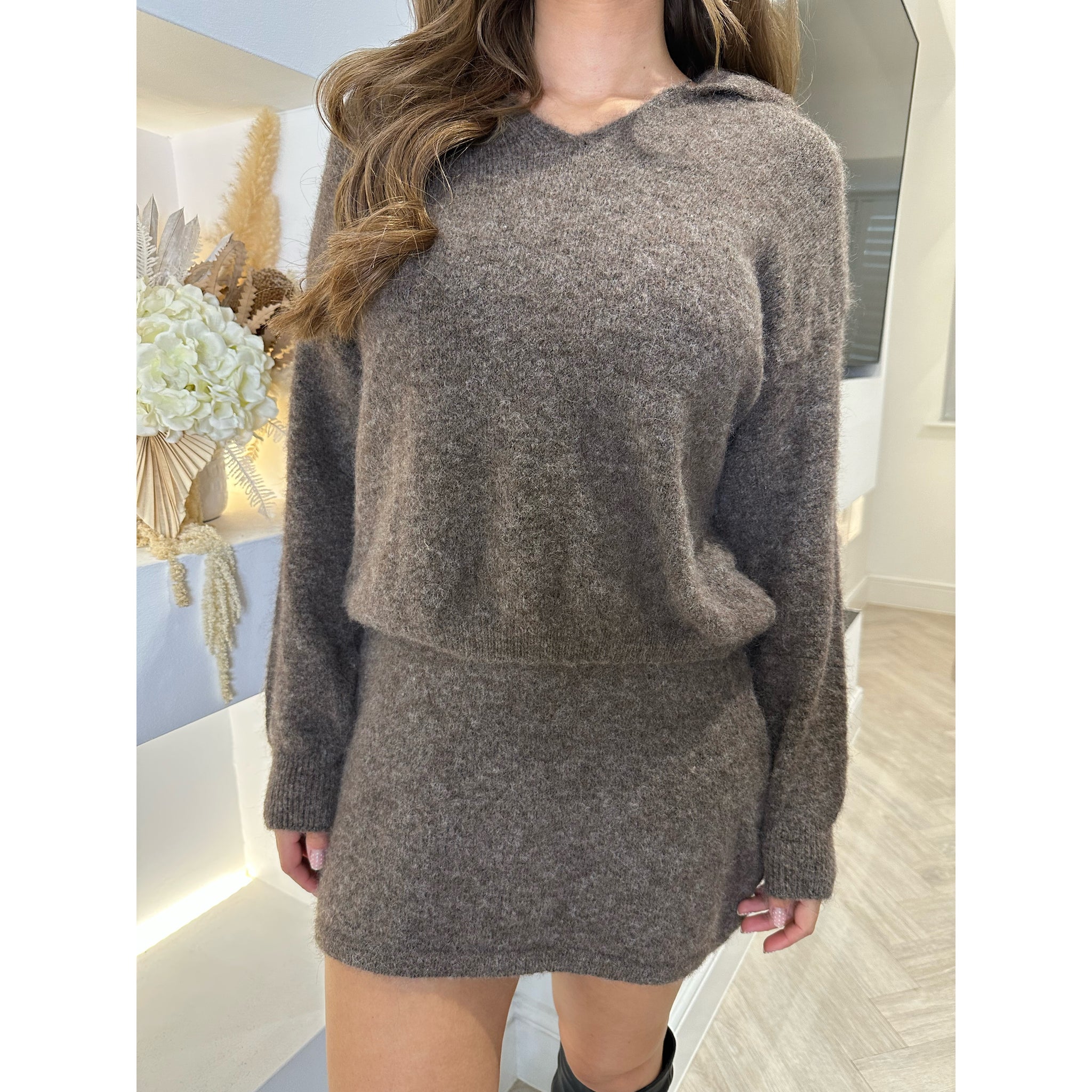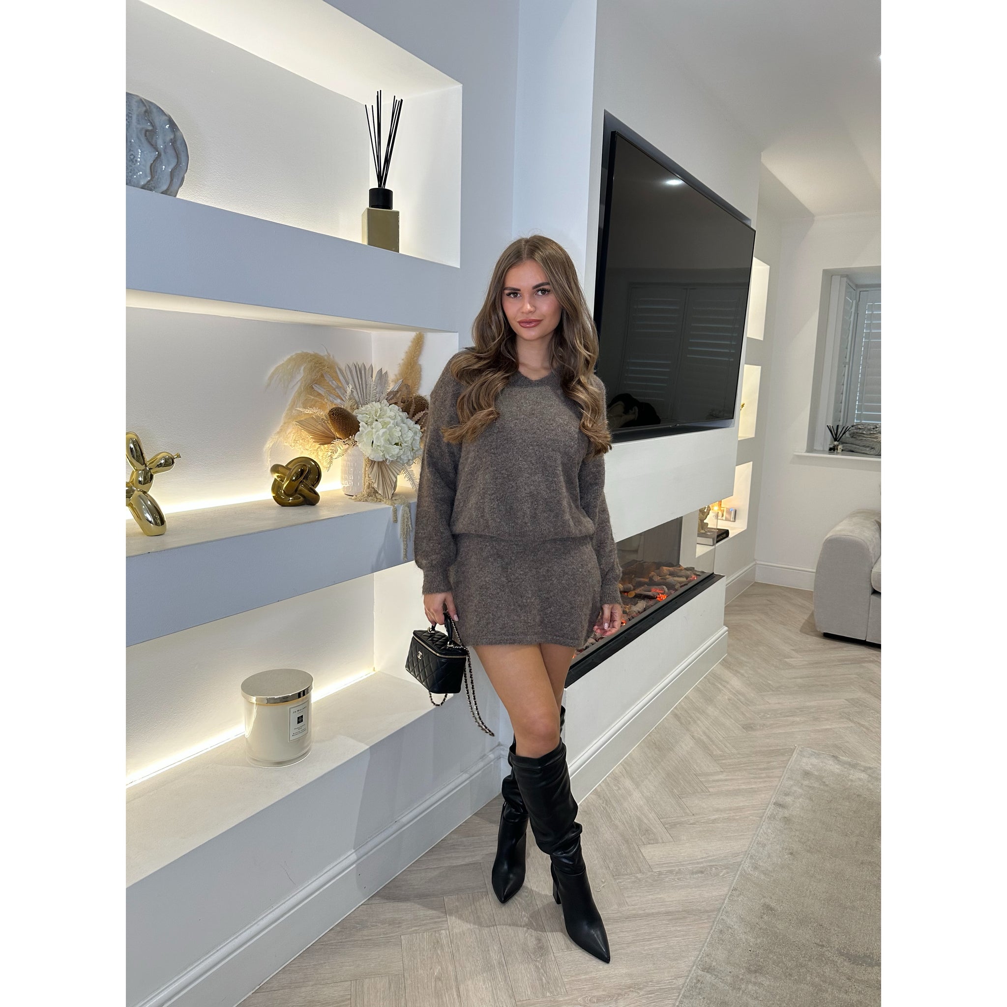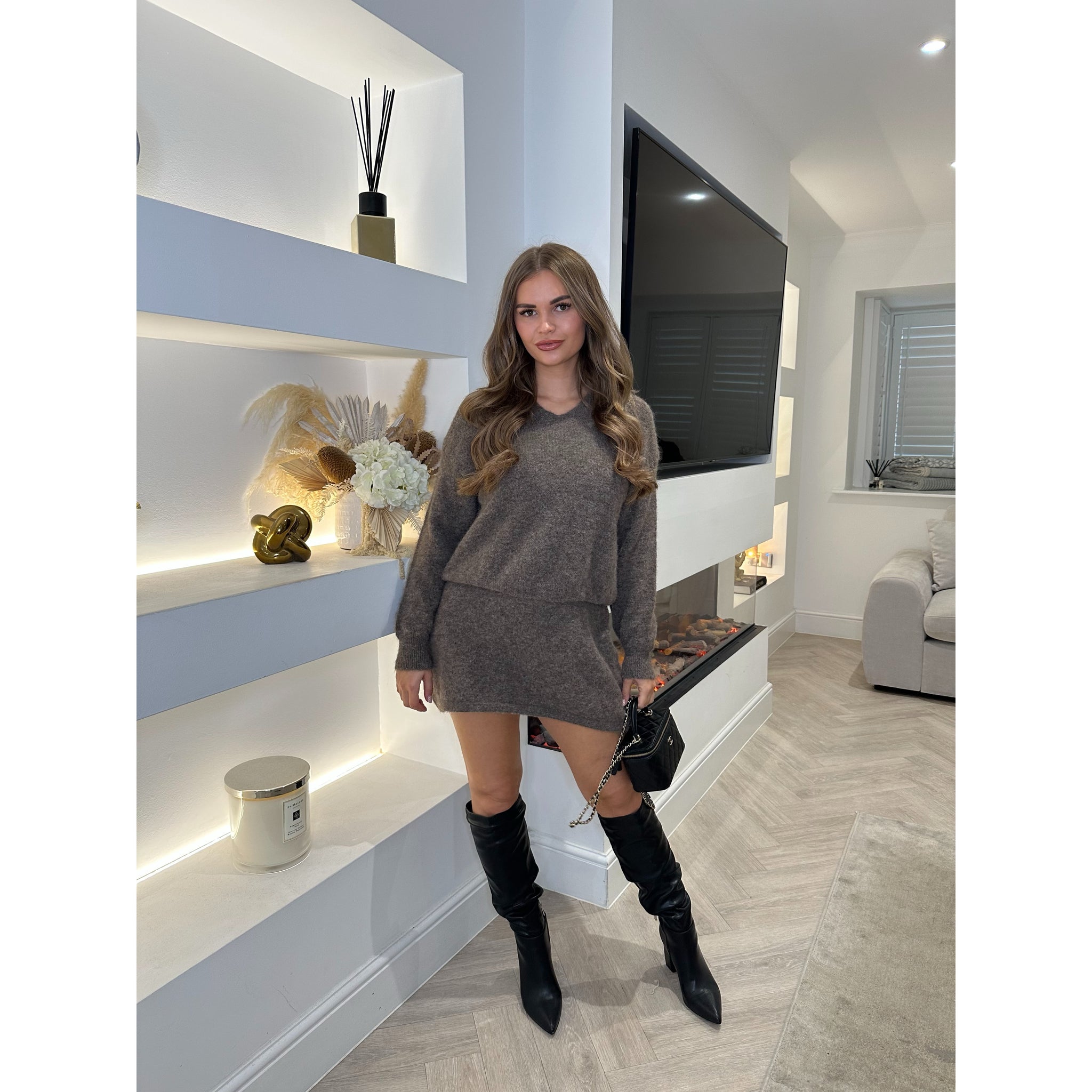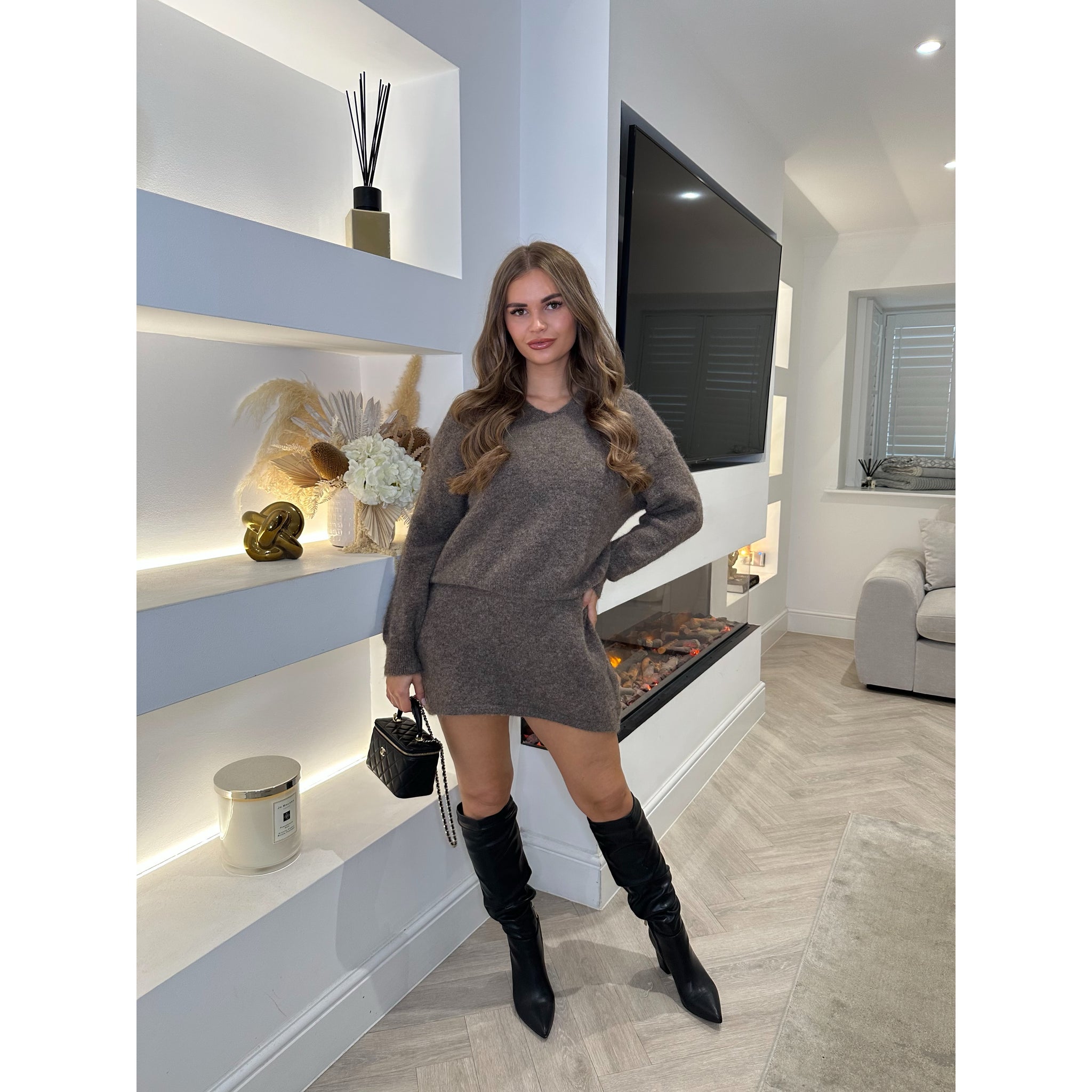 Brown Wool Blend Collared Knit Skirt Co Ord