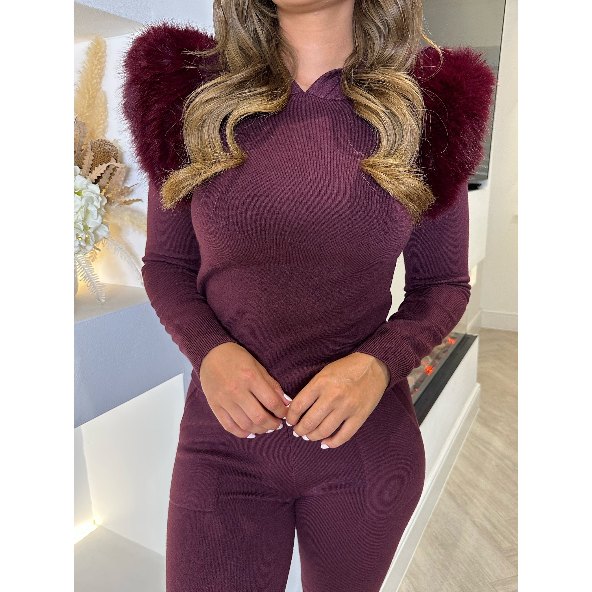 Burgundy Faux Fur Detail Knit Hooded Tracksuit