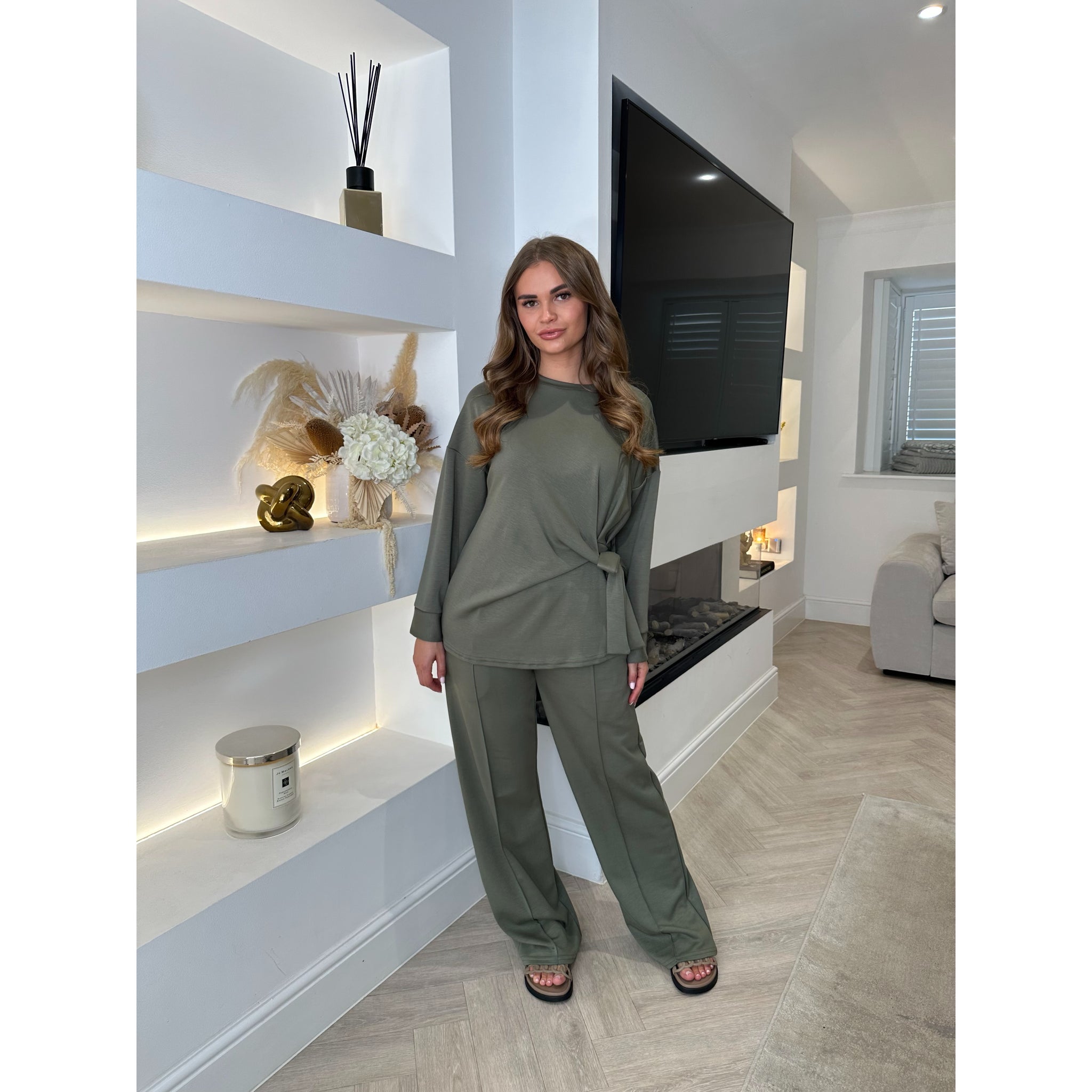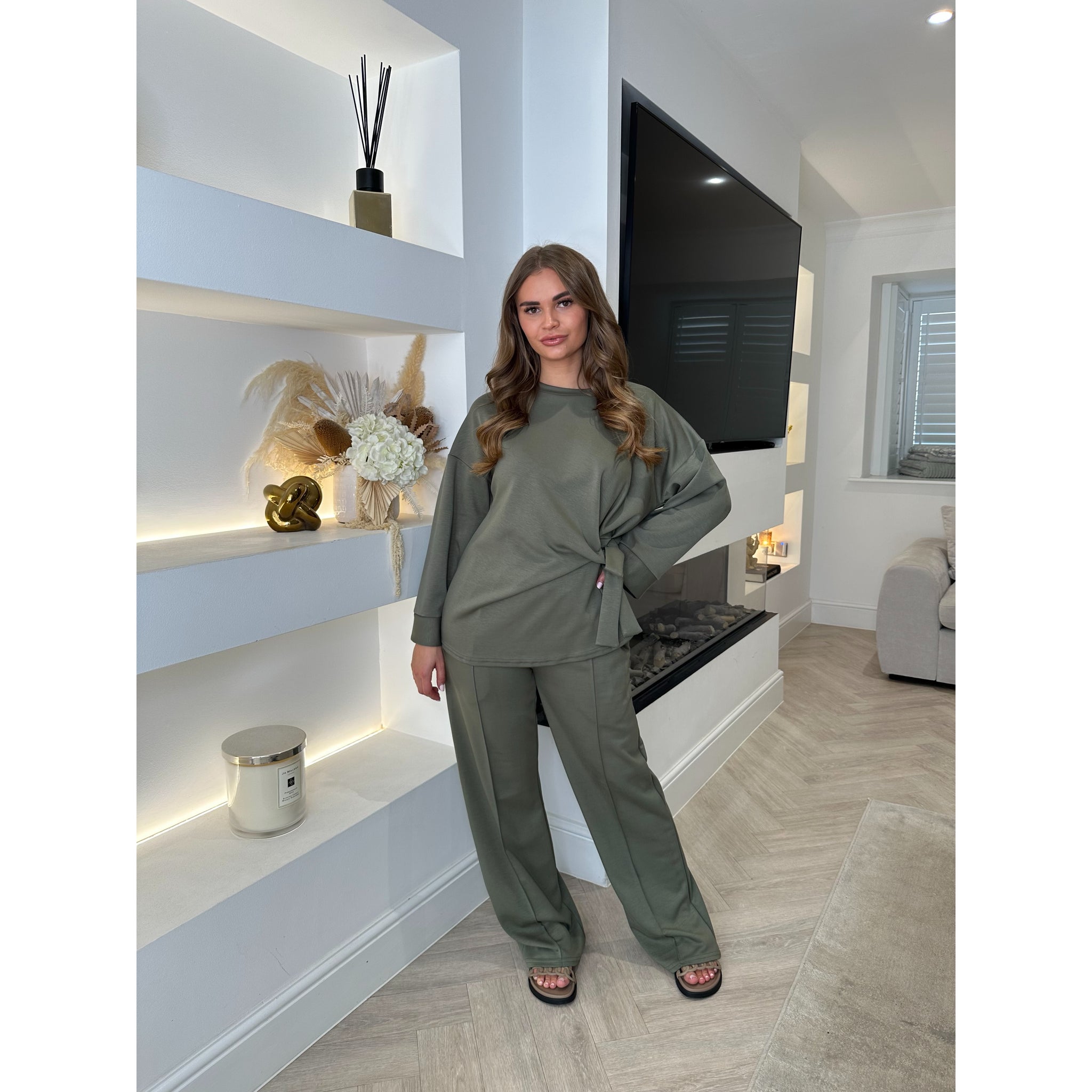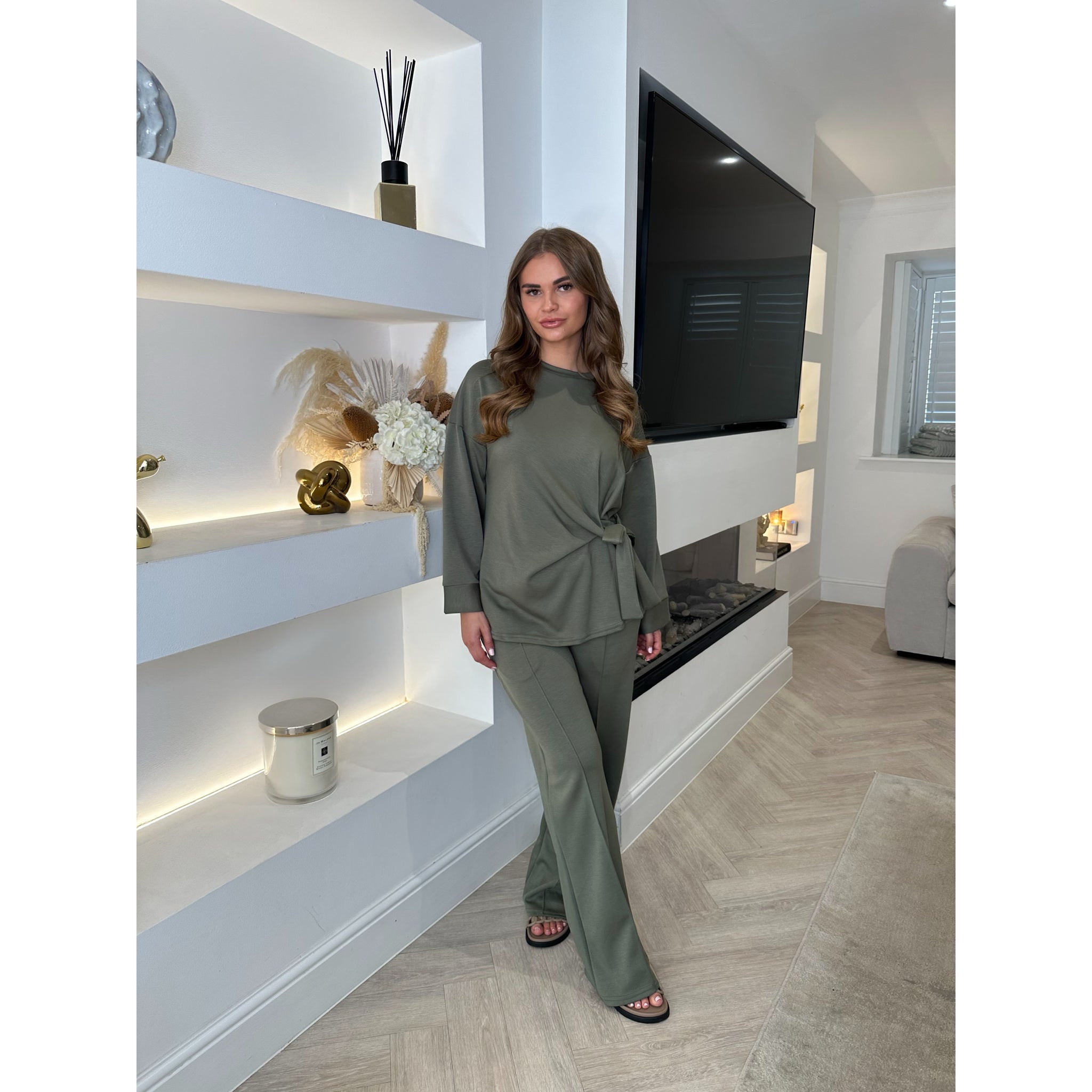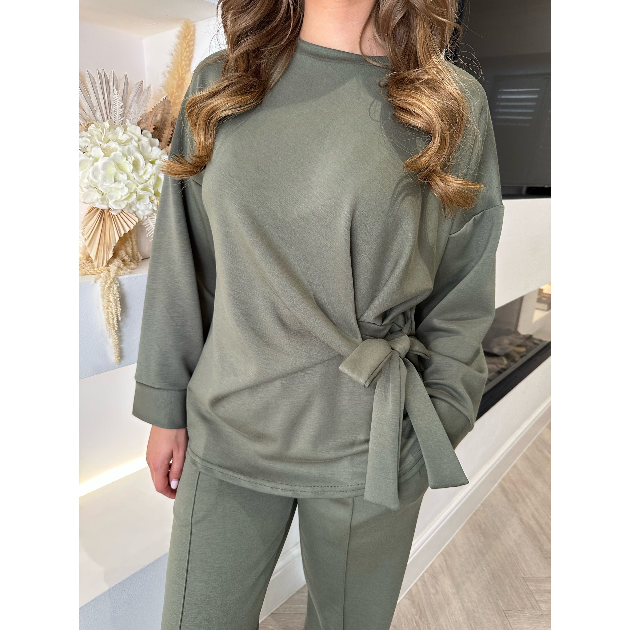 Khaki Tie Detail Wide Sleeve Lounge Set